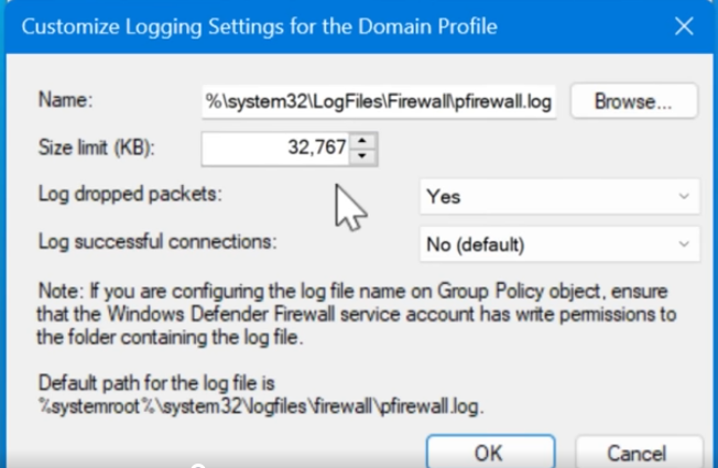Das geschriebene Log kann unter dem Pfad %systemroot%\system32\LogFiles\Firewalls gefunden werden. Es bietet sich auch an für jedes Profil der Firewall (Domäne/Privat/Öffentlich) der Log Datei einen eigenen sprechenden Namen zu geben.1
