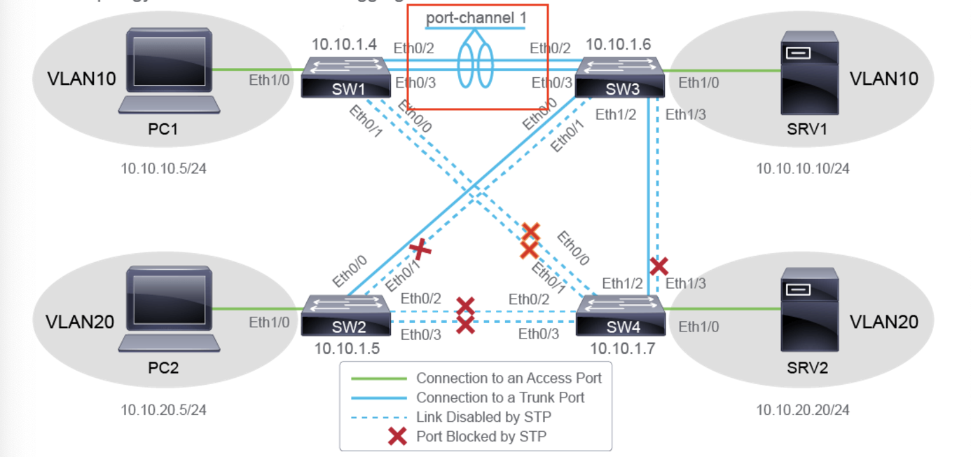 Wenn durch Spanning Tree ein Port in Blocking gesetzt wird kann dieser durch ein EtherChannel ersetzt werden. Für Spanning Tree werden die beiden physikalischen Ports durch einen (virtuellen) EtherChannel Port ersetzt.