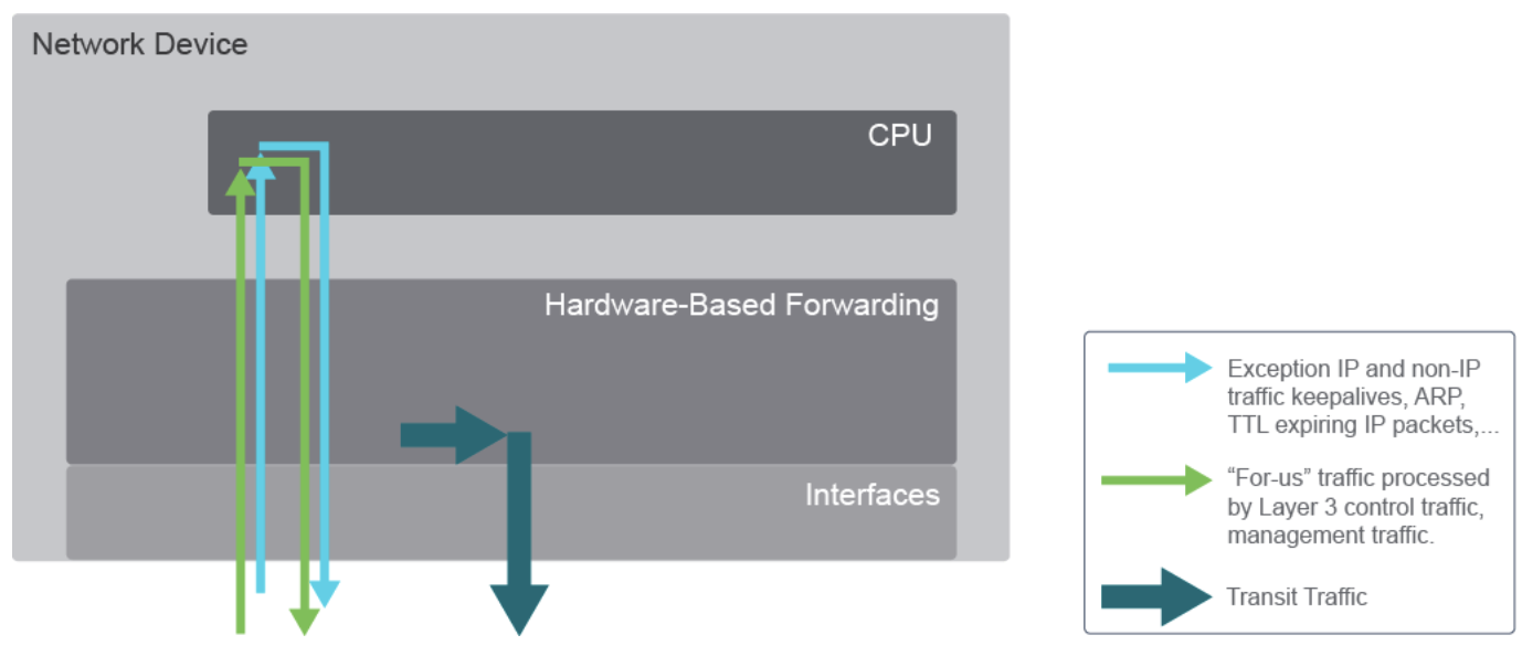 Netzwerk Geräte können grundsätzlich in ihrer Arbeitsweise, wie sie Datenpakete verarbeiten, in drei Schichten (Planes) unterteilt werden. In der Regel ist betrifft der Hauptteil der Datenpakete nur der die Data Plane und nur wenige Pakete die Management oder Control Plane.