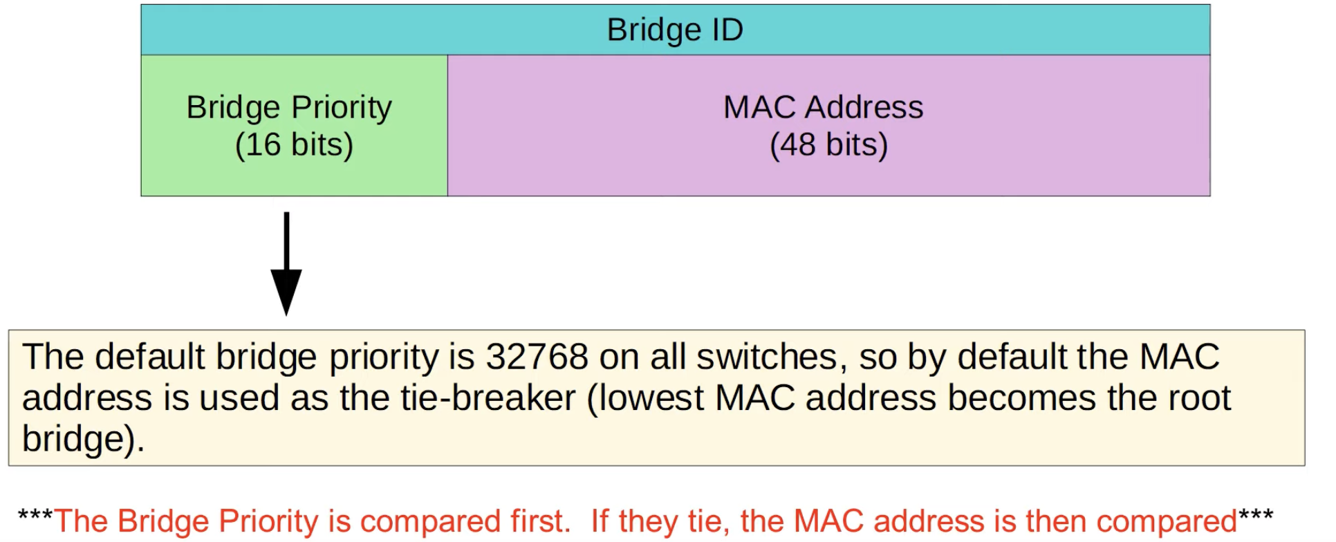 - Bridge ID: Bridge Priority (2Bytes) and MAC (6Bytes) forms the Bridge ID