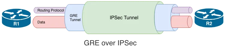 - Um nun auch OSPF oder andere Routing Protokolle über verschlüsselte Tunnel verschicken zu können muss das Packet zunächst über GRE getunnelt werden und anschließend über IPSec verschlüsselt verschicken. GRE ist nicht verschlüsselt!