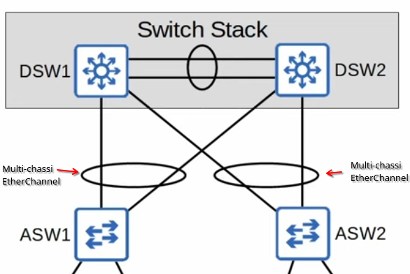 Sobald bspw. ein EtherChannel geformt wird, indem zwei Uplink Ports zu zwei unterschiedlichen physikalischen Switchen geführt werden, werden diese als Multi-chassi EtherChannel bezeichnet.