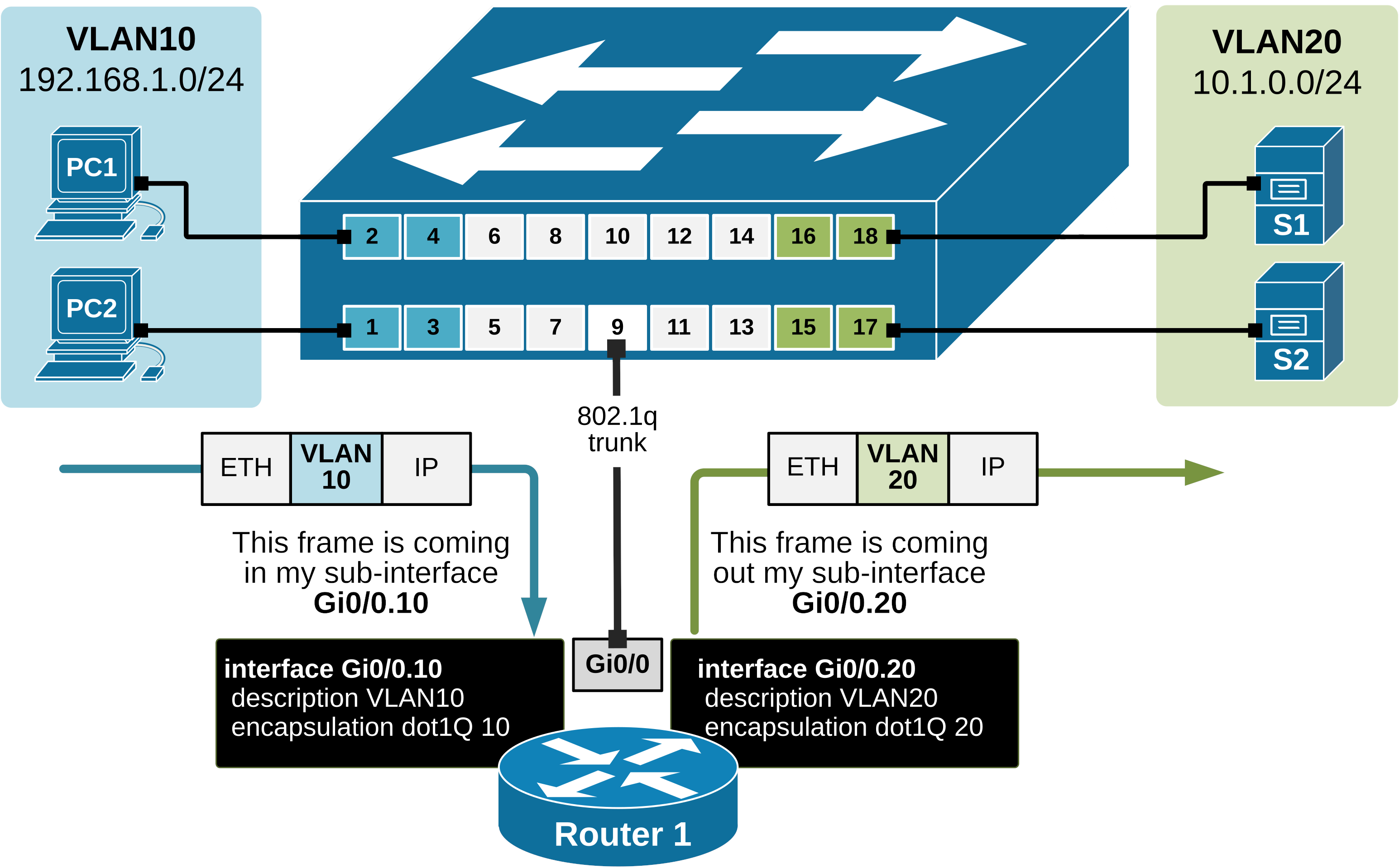 Dazu werden (mehrere) Sub-Interfaces auf dem physikalischen Interface angelegt. Auf der Gegenseite befindet sich in der Regel ein Switch dessen Port als ein Trunk konfiguriert ist. So können mehrere Layer 3 Netzwerke auf einer Layer 1 Verbindung übertragen werden.