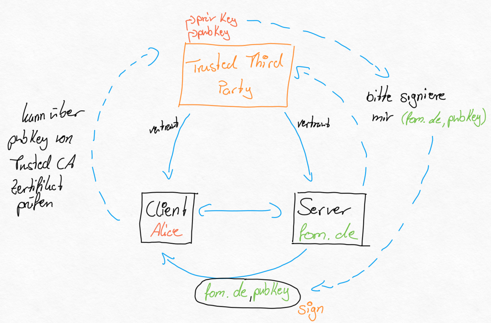 - Da im Diffie-Hellman Schlüsselaustausch der öffentliche Schlüssel genutzt wird um einen symmetrischen Sitzungsschlüssel abzuleiten, wird der öffentliche Schlüssel mit einem privaten Schlüssel signiert. Dieser wird wieder rum von der Gegenstelle durch den öffentlichen Schlüssel signierten Schlüssel (Zertifikat) verifiziert. Damit kann sichergestellt werden ob der öffentliche Schlüssel wirklich von Alice kommt.